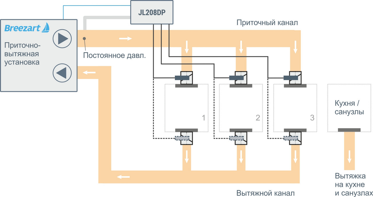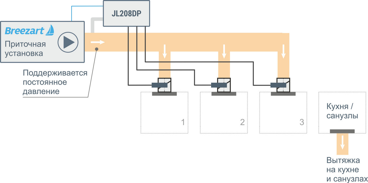 Это наиболее простое решение, которое обычно применяется в квартирах, где сложно разместить отдельную сеть вытяжных воздуховодов. Приточный воздух подается в жилые помещения, а удаление воздуха происходит через существующую естественную или механическую вытяжку в санузлах и на кухне (переток через дверные проёмы или щели). Объем вытяжного воздуха не регулируется, поэтому воздухообмен по помещениям зависит от расхода воздуха приточной