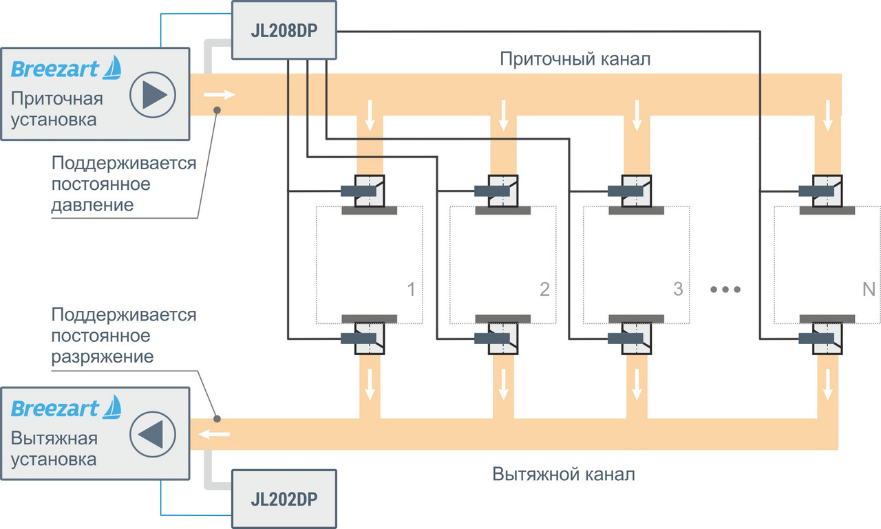 Выше мы рассмотрели принцип работы и особенности проектирования VAV-систем. Теперь мы расскажем о реализации VAV-системы на базе оборудования Breezart и модулях JetLogic JL208. Для создания VAV-систем можно использовать все приточные и приточно-вытяжные установки Breezart в стандартной конфигурации (то есть при заказе можно не указывать, что вентиляционная установка будет использована для построения VAV-системы).